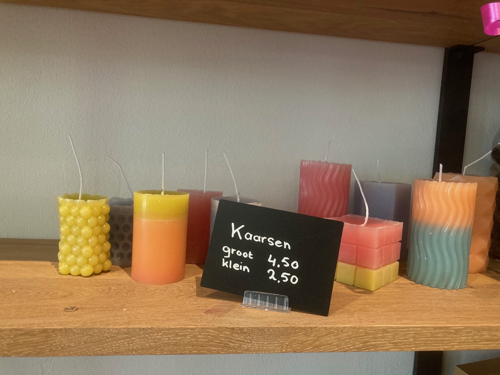 Deze kleurrijke kaarsen zijn vervaardigd van resten van gebruikte kaarsen , van o.a de kerk in Hoonhorst. Ze worden gemaakt door de jongste ondernemer van ons dorp. U kunt uw resten kaarsvet ook inleveren bij Anjerpunt Hoonhorst, dan maakt hij er weer mooie nieuwe van.
