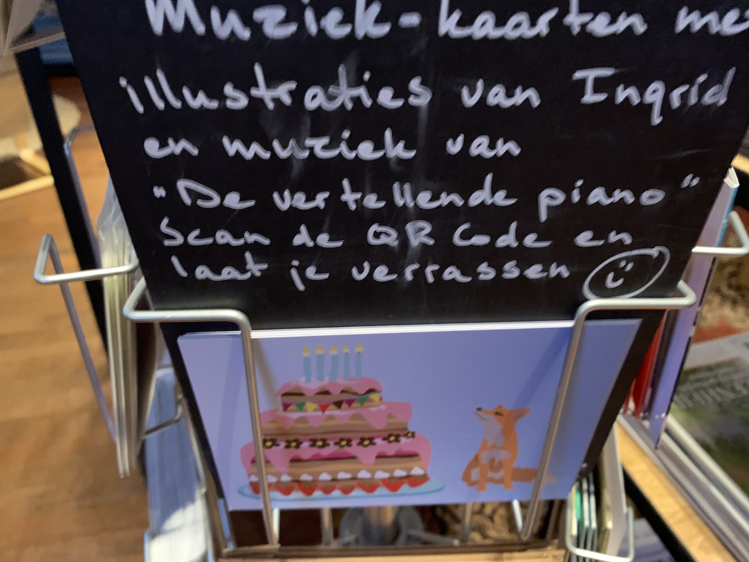 De muziek kaarten worden in een setje van 4 verkocht. Elke kaart heeft een illustratie gemaakt door een inwoonster uit Hoonhorst. En met de QR-code op de achterzijde luistert u naar de muziek van “de vertellende piano”.